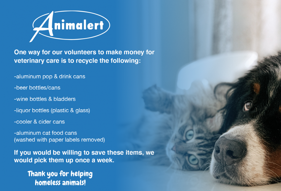 Help Animalert by donating your empty pop cans, beer cans & bottles, liquor/wine bottles (glass & plastic) & bladders in boxed wine (+ more) to us!